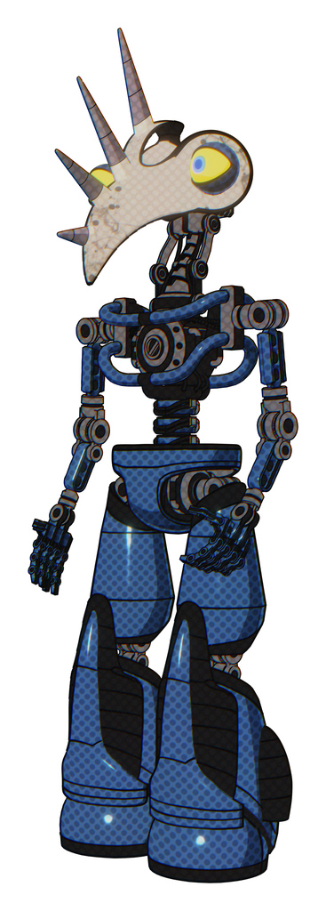 Automaton containing bird skull head and big yellow eyes and light chest exoshielding and no chest plating and light leg exoshielding and stomper foot mod. Blue halftone. Facing right view.