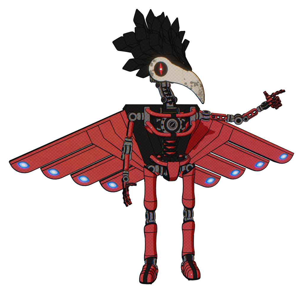 Cyborg containing bird skull head and red line eyes and crow feather design and light chest exoshielding and cherub wings design and no chest plating and ultralight foot exosuit. Primary red halftone.