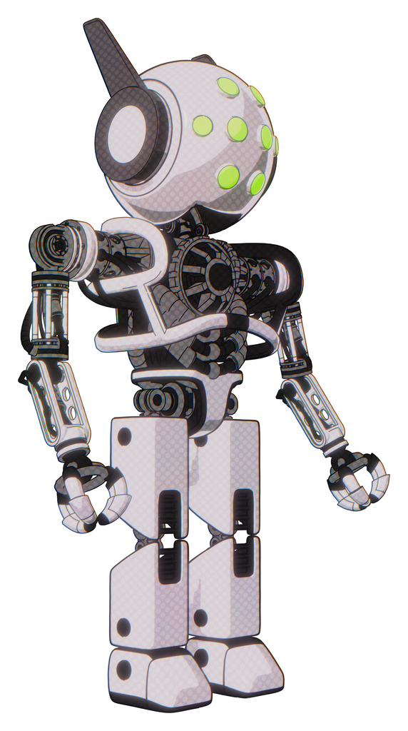 Bot containing round head and green eyes array and head winglets and heavy upper chest and no chest plating and prototype exoplate legs. White halftone toon. Facing left view.