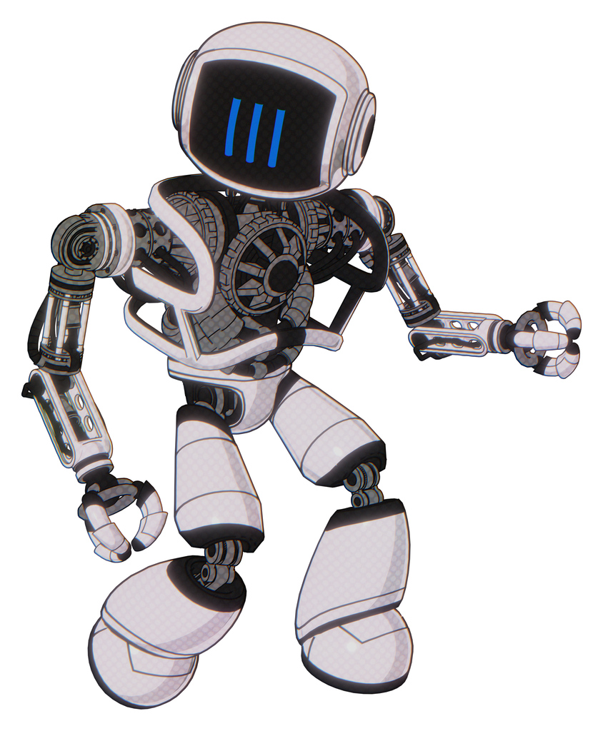 Mech containing digital display head and three vertical line design and heavy upper chest and no chest plating and light leg exoshielding. White halftone toon. Fight or defense pose..