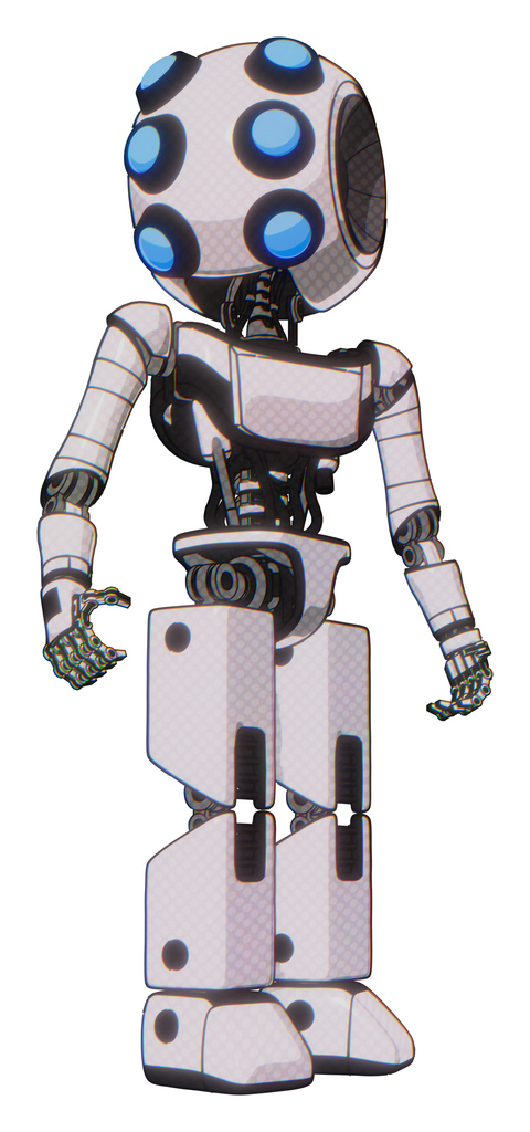 Automaton containing round head and six eye array and bug eyes and light chest exoshielding and ultralight chest exosuit and prototype exoplate legs. White halftone toon. Hero pose.