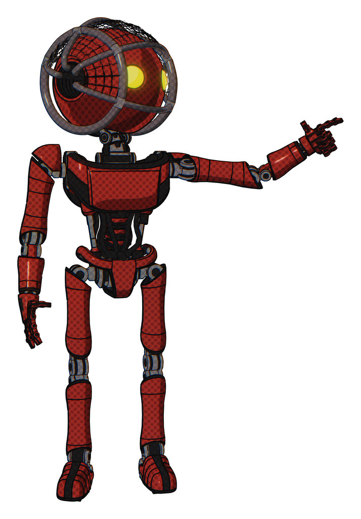 Robot containing oval wide head and yellow eyes and barbed wire cage helmet and light chest exoshielding and ultralight chest exosuit and ultralight foot exosuit. Cherry tomato red.
