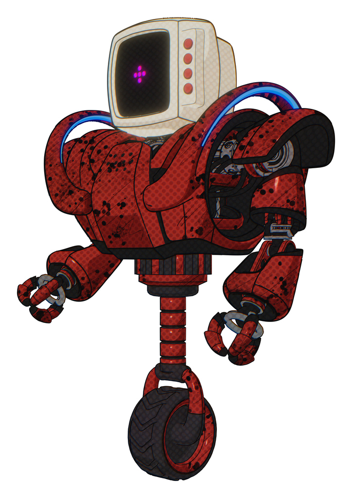 Automaton containing old computer monitor and magenta symbol display and red buttons and heavy upper chest and heavy mech chest and battle mech chest and unicycle wheel. Grunge dots cherry tomato red.