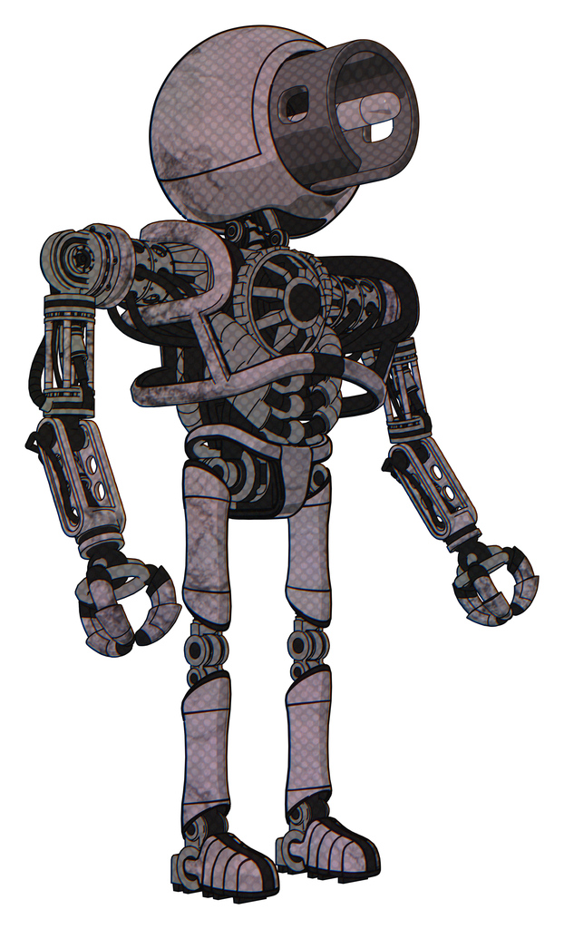 Cyborg containing cable connector head and heavy upper chest and no chest plating and ultralight foot exosuit. Dark dirty scrawl sketch. Facing left view.