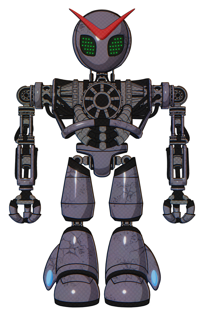 Mech containing grey alien style head and led array eyes and heavy upper chest and no chest plating and light leg exoshielding. Light lavender metal. Front view.