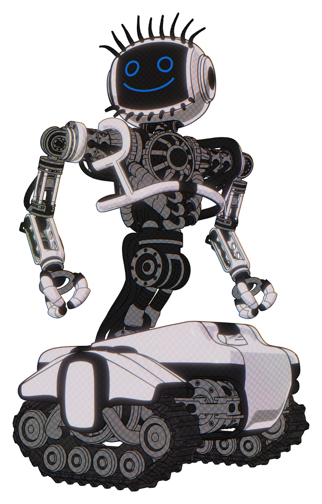 Automaton containing digital display head and happy face and eye lashes deco and heavy upper chest and no chest plating and tank tracks. White halftone toon. Hero pose.