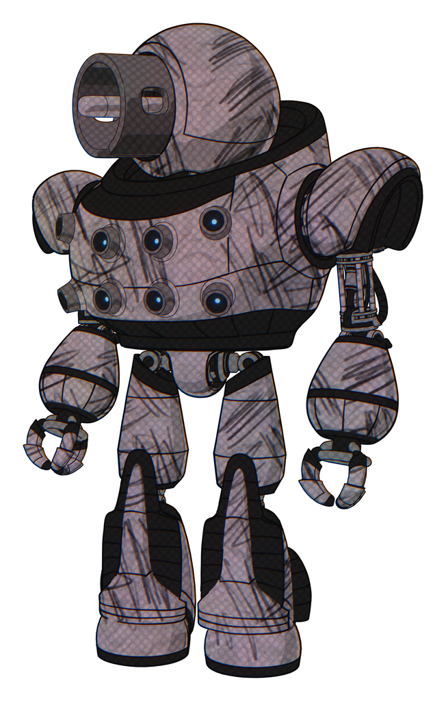 Mech containing cable connector head and heavy upper chest and chest energy sockets and light leg exoshielding and stomper foot mod. Dark sketchy. Standing looking right restful pose.