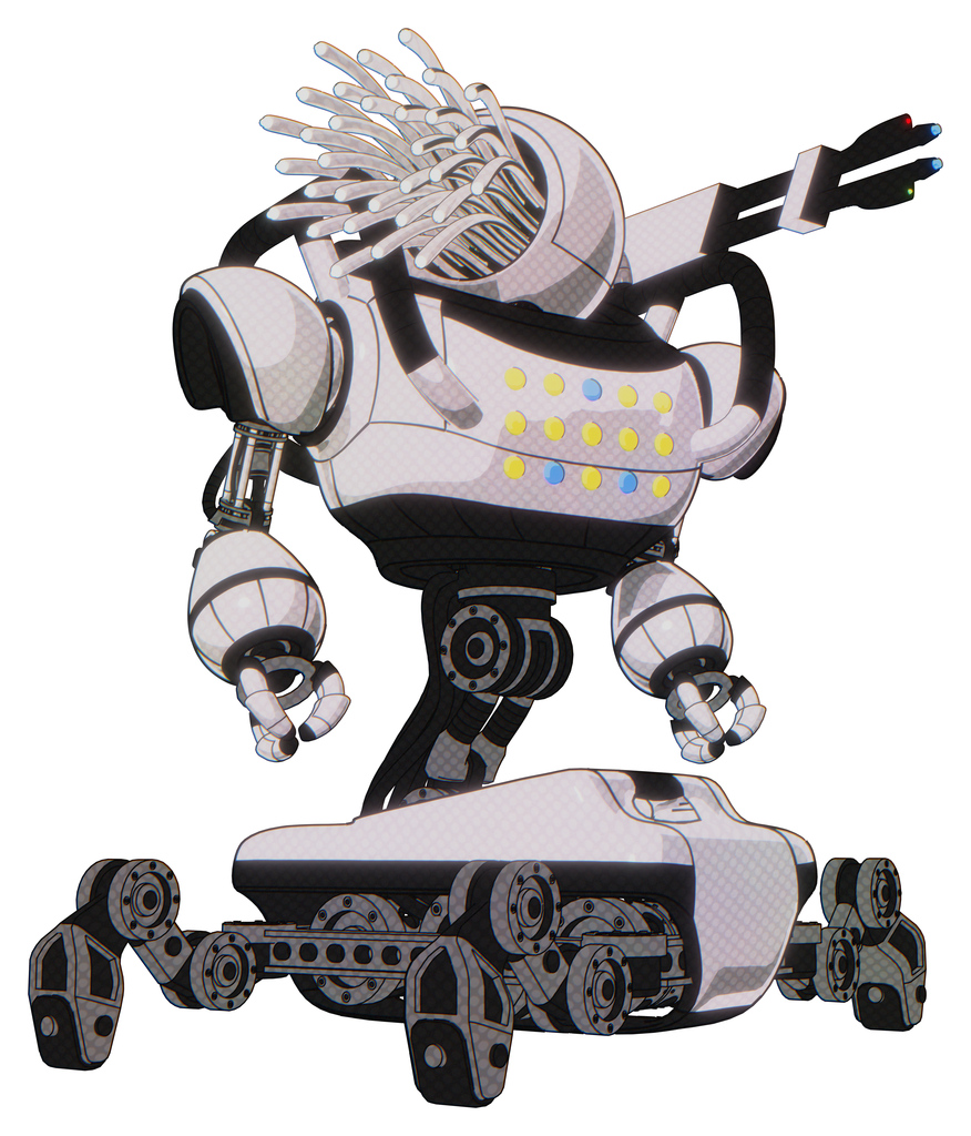 Bot containing round fiber optic connectors head and heavy upper chest and colored lights array and insect walker legs. White halftone toon. Hero pose.