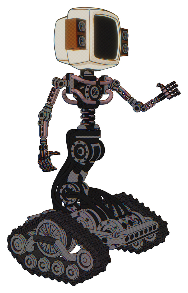 Cyborg containing old computer monitor and old retro speakers and light chest exoshielding and no chest plating and tank tracks. Grayish pink. Interacting.
