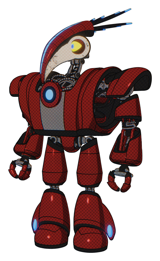Robot containing bird skull head and big yellow eyes and head shield design and heavy upper chest and heavy mech chest and blue energy fission element chest and light leg exoshielding. Matted red.