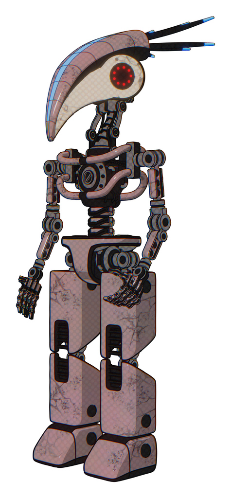 Robot containing bird skull head and red led circle eyes and head shield design and light chest exoshielding and no chest plating and prototype exoplate legs. Powder pink metal. Facing right view.