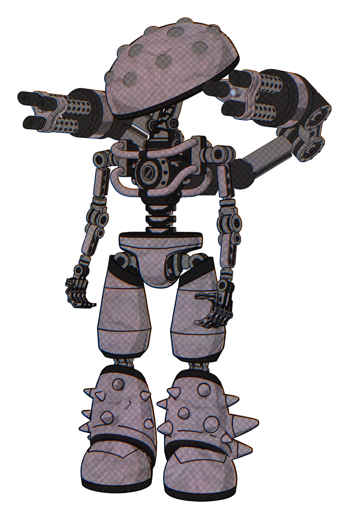 Bot containing metal knucklehead design and light chest exoshielding and minigun back assembly and no chest plating and light leg exoshielding and spike foot mod. Dark sketch.
