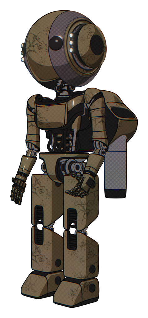 Bot containing round head and maru eyes and head light gadgets and light chest exoshielding and ultralight chest exosuit and rocket pack and prototype exoplate legs. Desert tan painted.