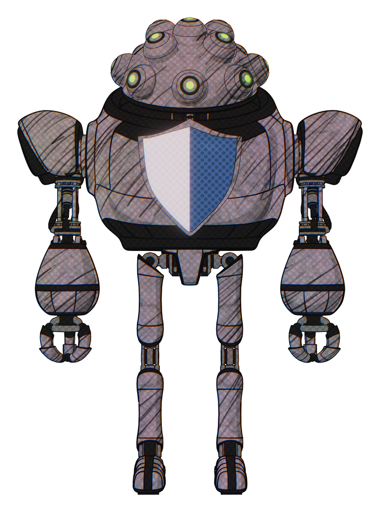 Cyborg containing techno multi-eyed domehead design and heavy upper chest and blue shield defense design and ultralight foot exosuit. Dark sketch lines. Front view.
