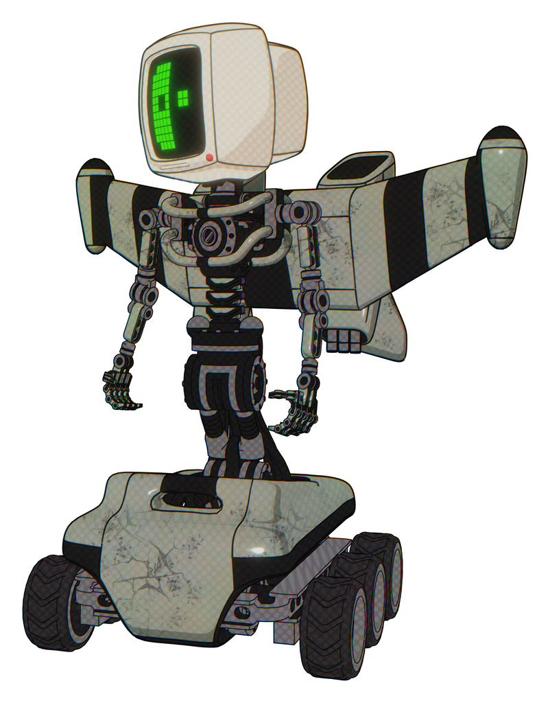 Droid containing old computer monitor and abstract mask pixel face and light chest exoshielding and stellar jet wing rocket pack and no chest plating and six-wheeler base. Green metal.