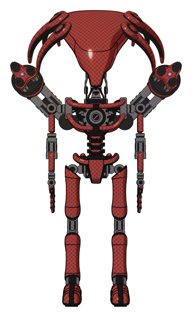 Mech containing flat elongated skull head and light chest exoshielding and minigun back assembly and no chest plating and ultralight foot exosuit. Light brick red. Front view.