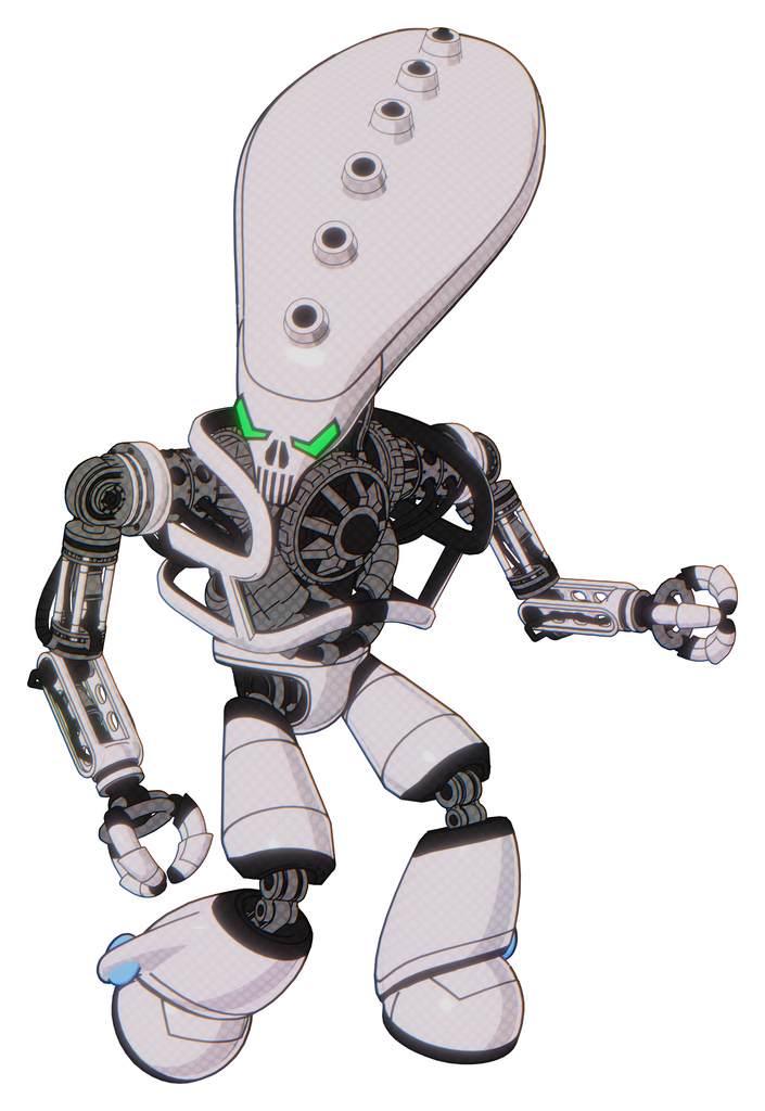 Robot containing flat elongated skull head and heavy upper chest and no chest plating and light leg exoshielding. White halftone toon. Fight or defense pose..