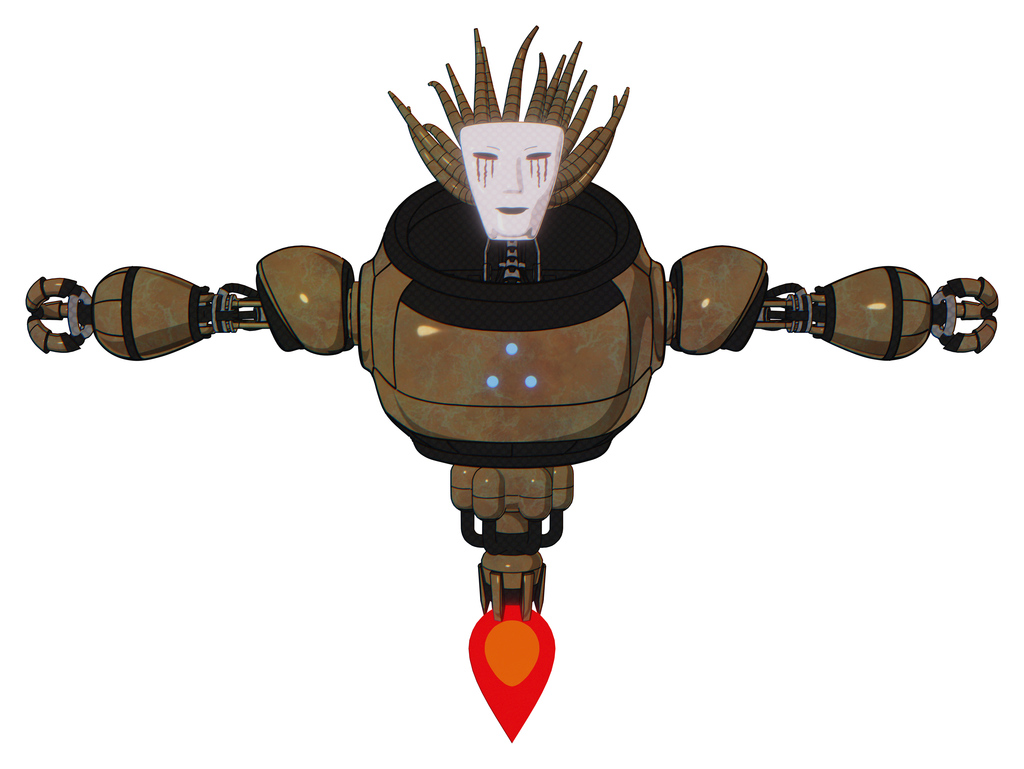 Robot containing humanoid face mask and blood tears and heavy upper chest and triangle of blue leds and jet propulsion. Old copper. T-pose.
