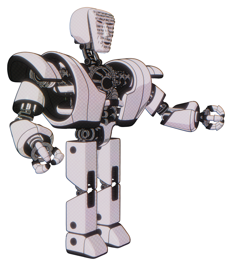 Droid containing humanoid face mask and binary war paint and heavy upper chest and heavy mech chest and prototype exoplate legs. White halftone toon. Interacting.