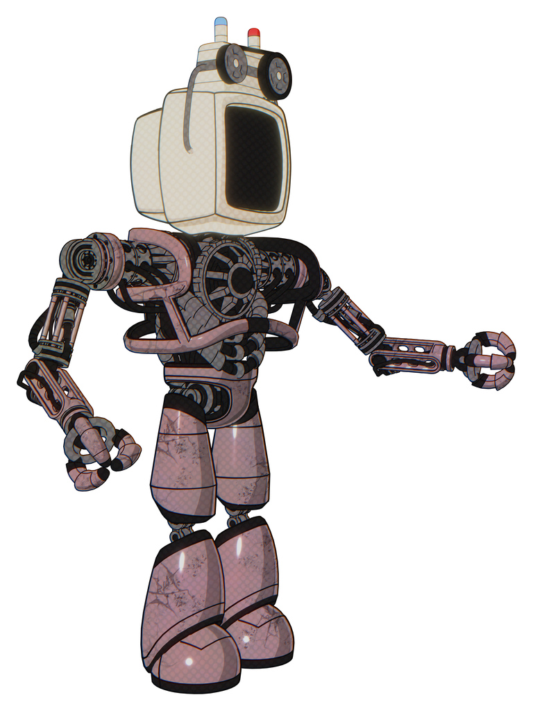 Bot containing old computer monitor and old computer magnetic tape and heavy upper chest and no chest plating and light leg exoshielding. Grayish pink. Interacting.