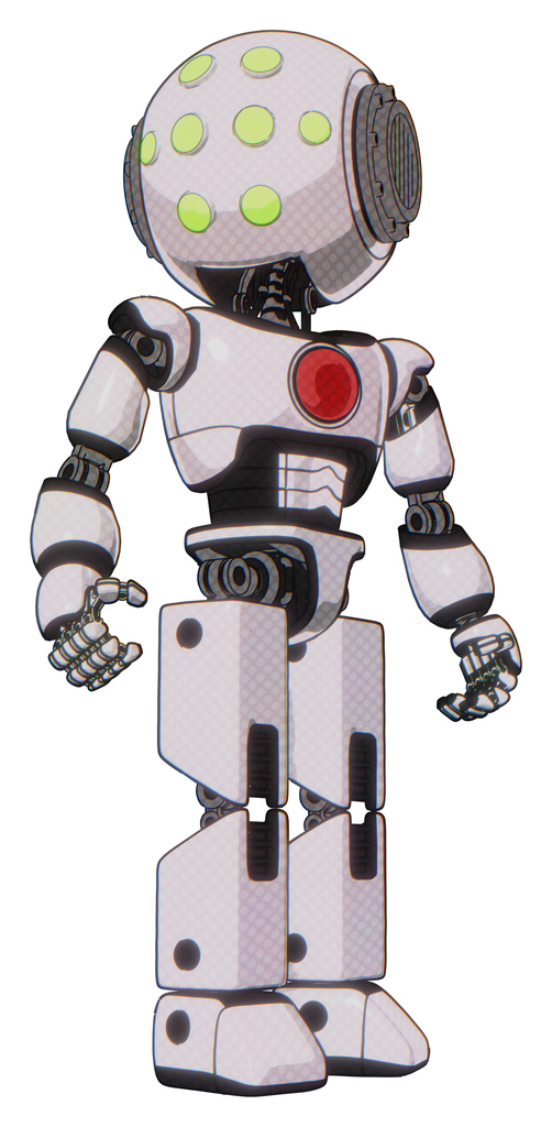 Cyborg containing round head and green eyes array and light chest exoshielding and red chest button and prototype exoplate legs. White halftone toon. Hero pose.