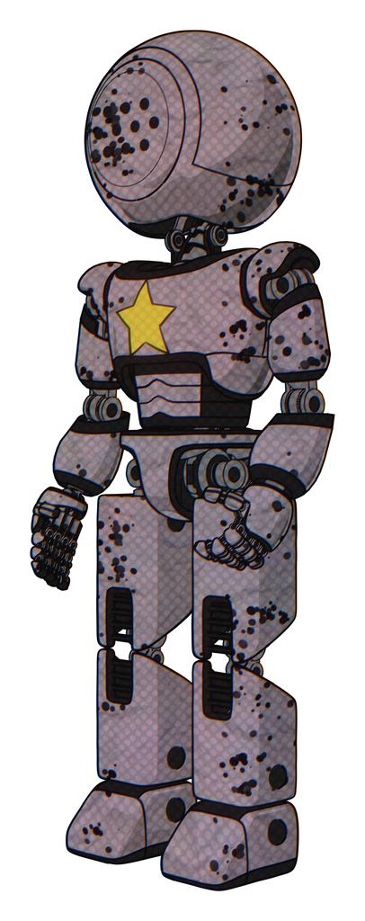 Droid containing dots array face and light chest exoshielding and yellow star and prototype exoplate legs. Dark ink dots sketch. Facing right view.