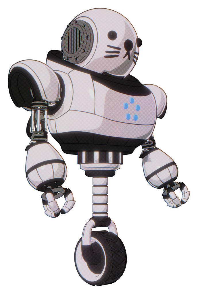 Bot containing round head and heavy upper chest and circle of blue leds and unicycle wheel and cat face. White halftone toon. Facing left view.
