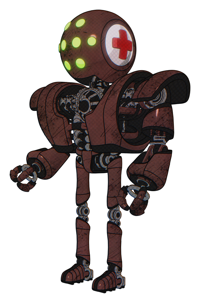 Automaton containing round head and green eyes array and first aid emblem and heavy upper chest and heavy mech chest and ultralight foot exosuit. Steampunk copper. Facing right view.