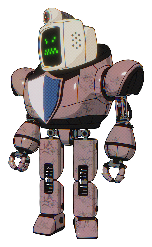 Automaton containing old computer monitor and angry pixels face and retro-futuristic webcam and heavy upper chest and blue shield defense design and prototype exoplate legs. Powder pink metal.