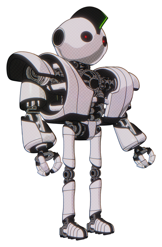 Automaton containing oval wide head and small red led eyes and techno mohawk and heavy upper chest and heavy mech chest and ultralight foot exosuit. White halftone toon. Facing left view.
