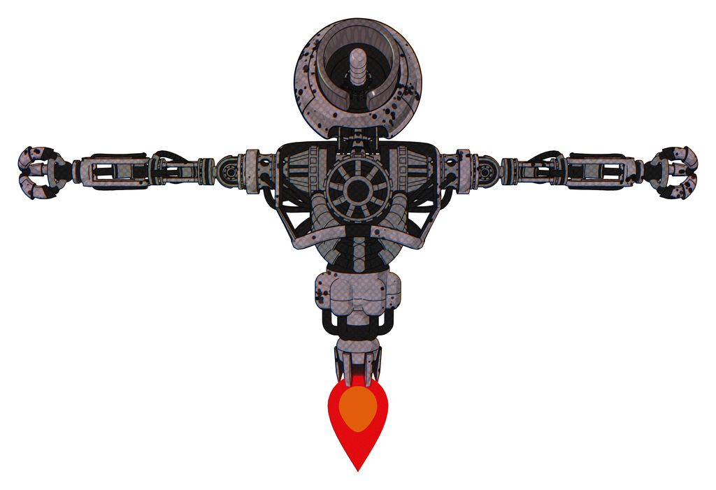 Droid containing cable connector head and heavy upper chest and no chest plating and jet propulsion. Dark ink dots sketch. T-pose.