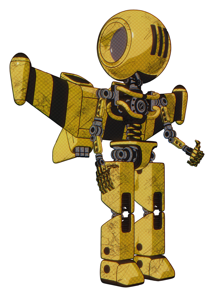 Robot containing round head and three lens sentinel visor and light chest exoshielding and stellar jet wing rocket pack and no chest plating and prototype exoplate legs. Construction yellow halftone.