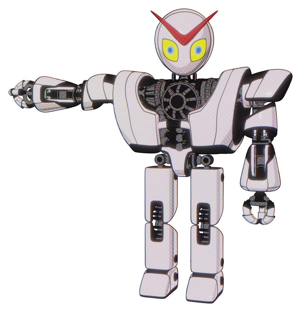 Mech containing grey alien style head and yellow eyes with blue pupils and heavy upper chest and heavy mech chest and prototype exoplate legs. White halftone toon. Arm out holding invisible object..