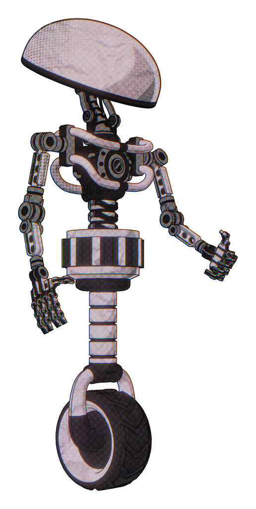 Robot containing dome head and light chest exoshielding and no chest plating and unicycle wheel. Sketch pad dots pattern. Facing left view.