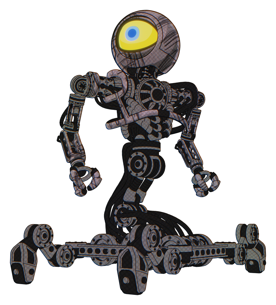 Cyborg containing giant eyeball head design and heavy upper chest and no chest plating and insect walker legs. Dark sketchy. Hero pose.