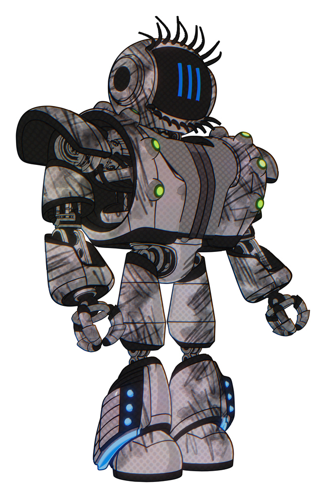 Mech containing digital display head and three vertical line design and eye lashes deco and heavy upper chest and heavy mech chest and green cable sockets array .