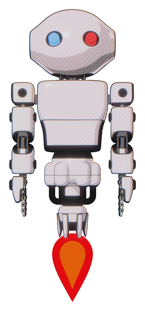 Automaton containing oval wide head and giant blue and red led eyes and light chest exoshielding and prototype exoplate chest and jet propulsion. White halftone toon. Front view.