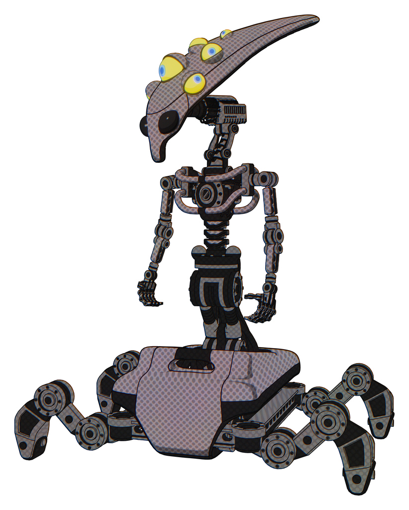 Cyborg containing flat elongated skull head and yellow eyeball array and light chest exoshielding and no chest plating and insect walker legs. Halftone gray. Standing looking right restful pose.