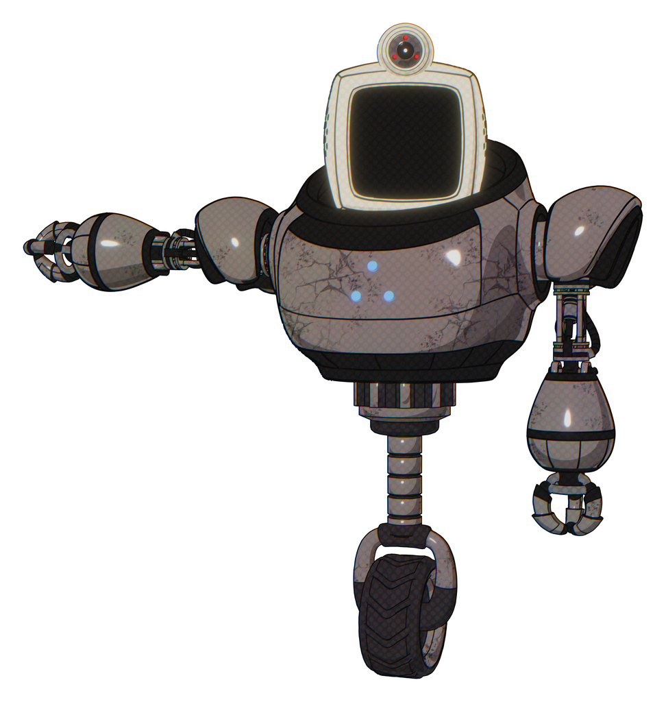 Droid containing old computer monitor and retro-futuristic webcam and heavy upper chest and triangle of blue leds and unicycle wheel. Light pink beige. Arm out holding invisible object..