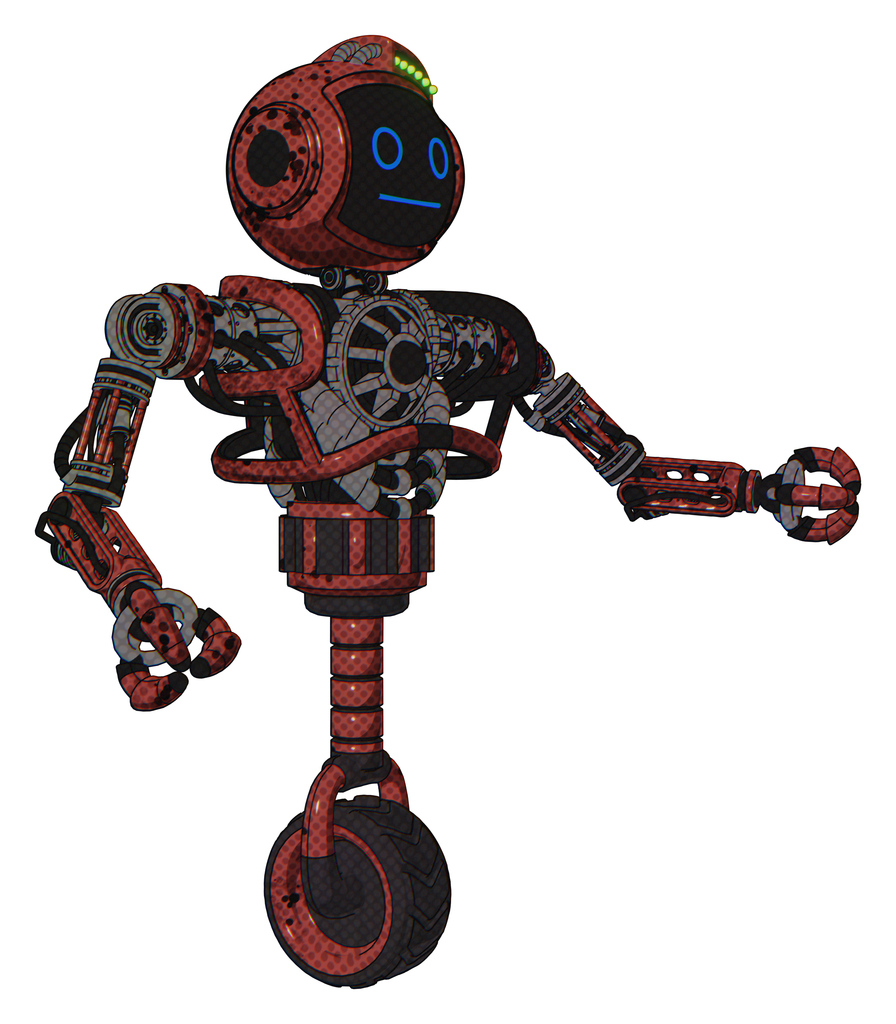 Cyborg containing digital display head and blank-faced expression and green led array and heavy upper chest and no chest plating and unicycle wheel. Grunge matted orange. Interacting.