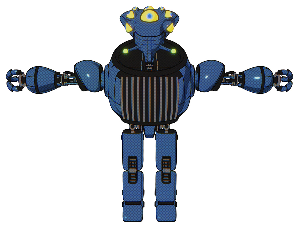 Bot containing flat elongated skull head and yellow eyeball array and heavy upper chest and chest vents and prototype exoplate legs. Blue halftone. T-pose.