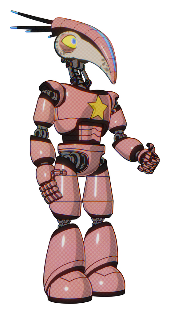 Droid containing bird skull head and big yellow eyes and head shield design and light chest exoshielding and yellow star and light leg exoshielding. Toon pink tint. Facing left view.