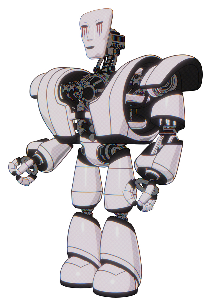 Automaton containing humanoid face mask and blood tears and heavy upper chest and heavy mech chest and light leg exoshielding. White halftone toon. Facing right view.