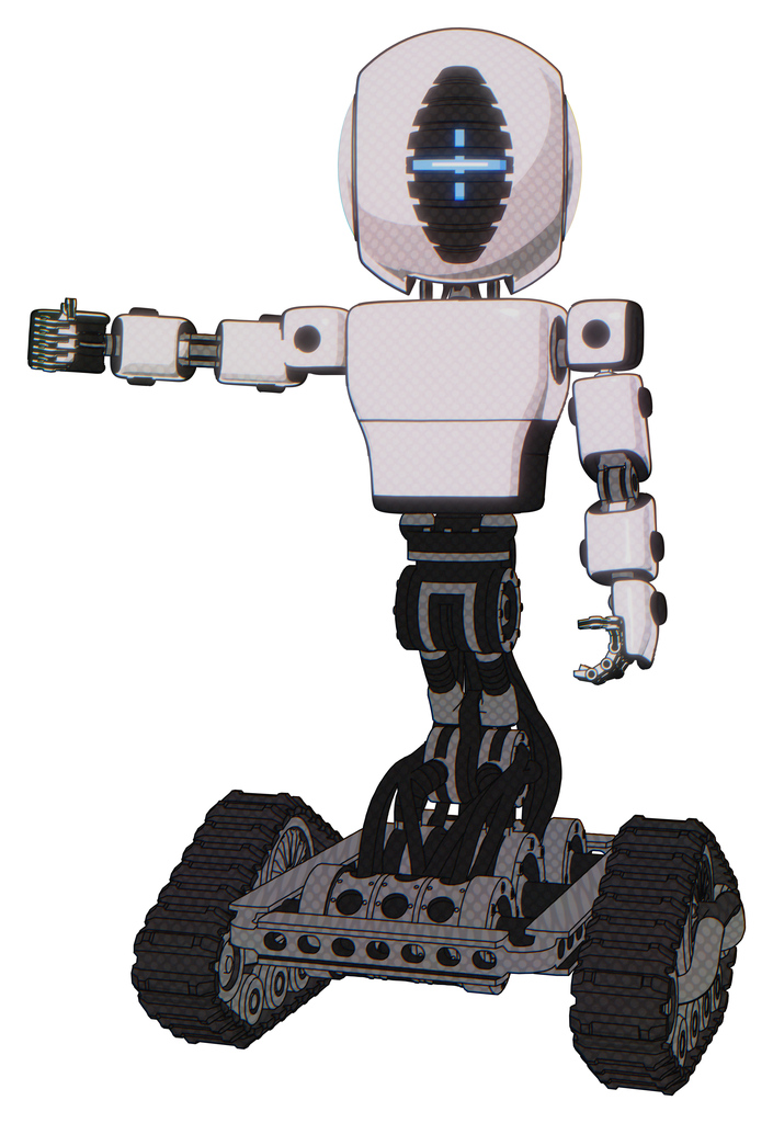Droid containing round head and vertical cyclops visor and light chest exoshielding and prototype exoplate chest and tank tracks. White halftone toon. Arm out holding invisible object..