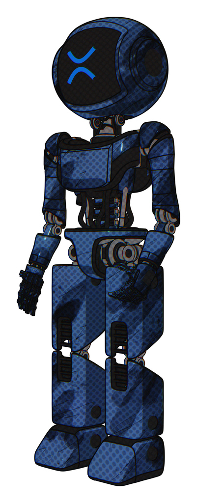 Mech containing digital display head and wince symbol expression and light chest exoshielding and ultralight chest exosuit and prototype exoplate legs. Grunge dark blue. Facing right view.