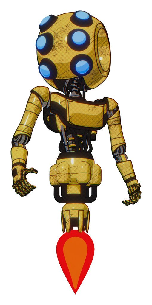 Droid containing round head and six eye array and bug eyes and light chest exoshielding and ultralight chest exosuit and jet propulsion. Construction yellow halftone. Hero pose.