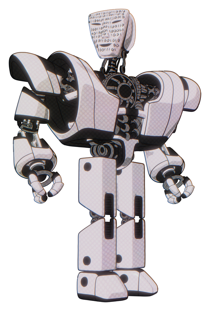 Droid containing humanoid face mask and binary war paint and heavy upper chest and heavy mech chest and prototype exoplate legs. White halftone toon. Hero pose.
