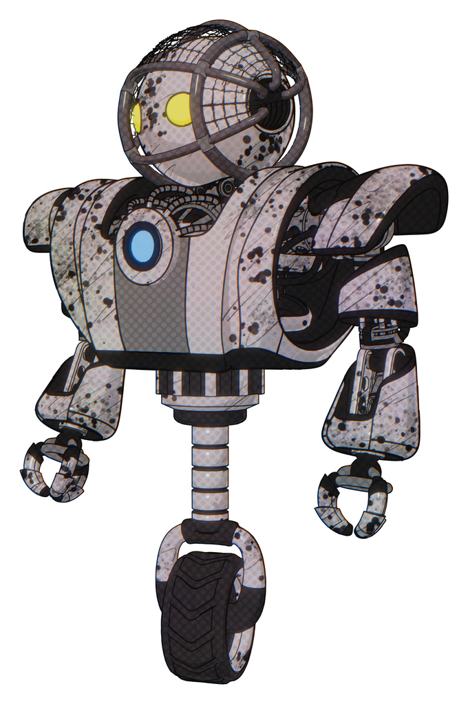Bot containing oval wide head and yellow eyes and barbed wire cage helmet and heavy upper chest and heavy mech chest and blue energy fission element chest and unicycle wheel. Grunge sketch dots.
