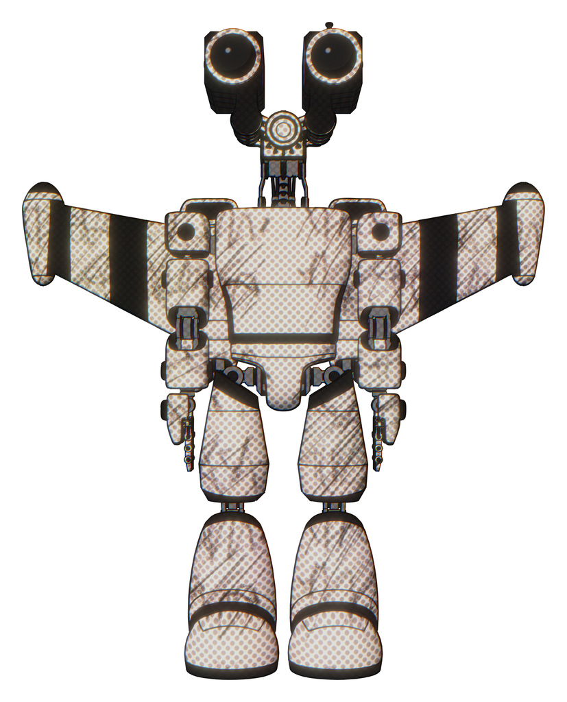 Automaton containing dual retro camera head and light chest exoshielding and prototype exoplate chest and stellar jet wing rocket pack and light leg exoshielding. Halftone sketch. Front view.