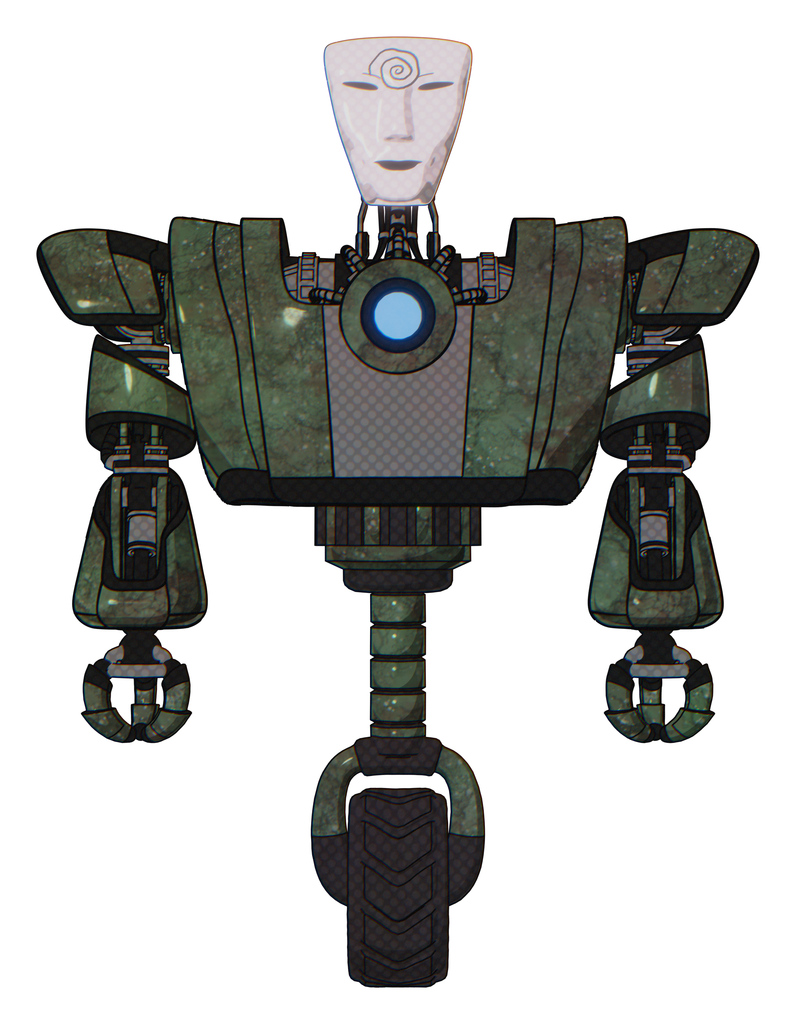 Droid containing humanoid face mask and spiral design and heavy upper chest and heavy mech chest and blue energy fission element chest and unicycle wheel. Old corroded copper. Front view.